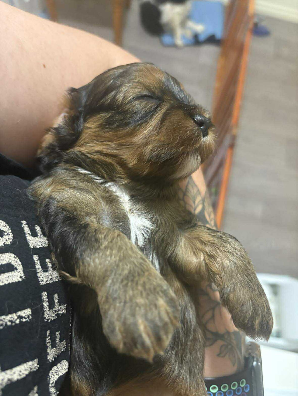 Kuma is the 5th in the litter and is a lovely mix of dark brown, tan & black with a white patch on his chest and chin. He is a hearty little boy who tries to get all of his siblings involved when trying to play.